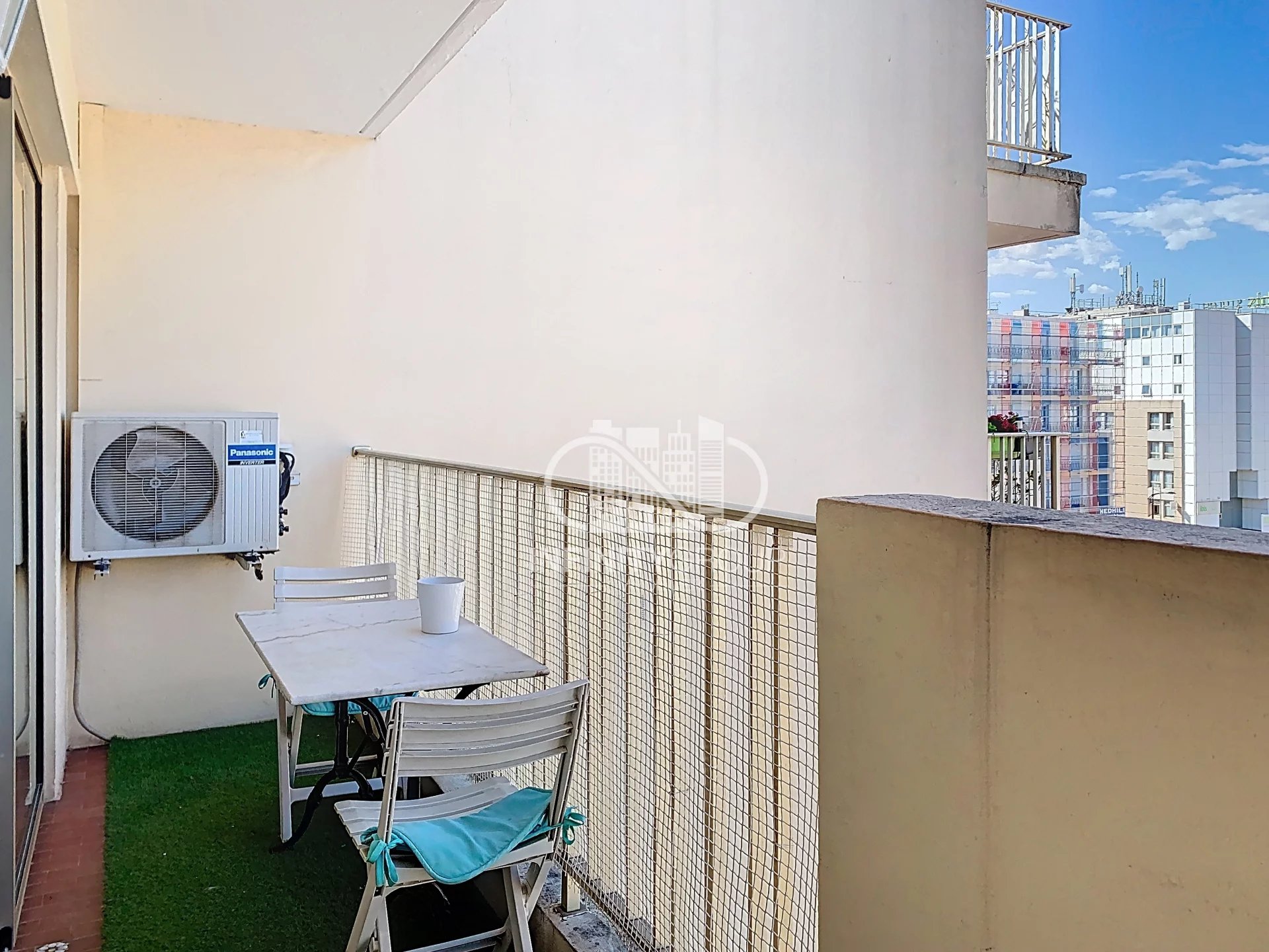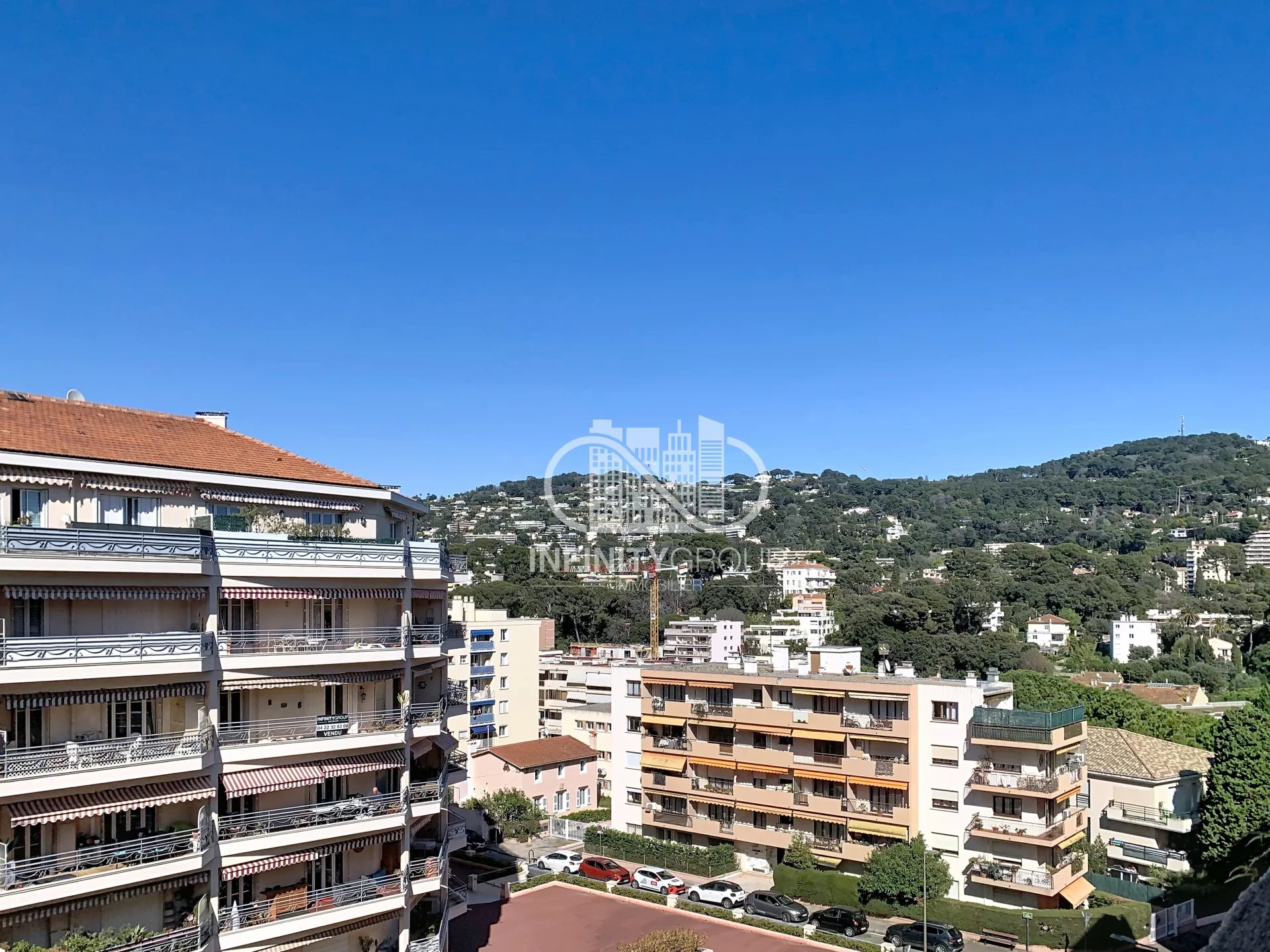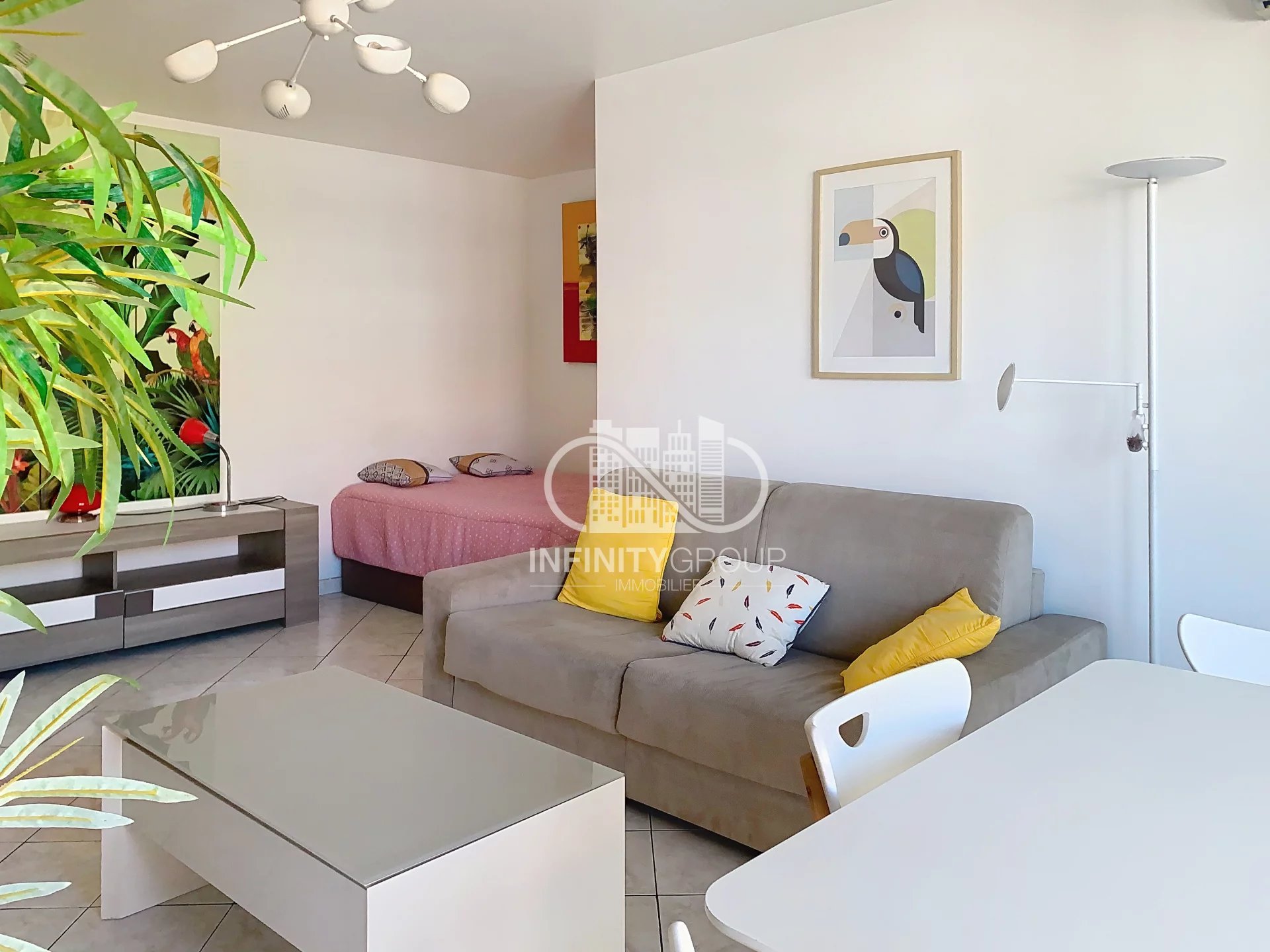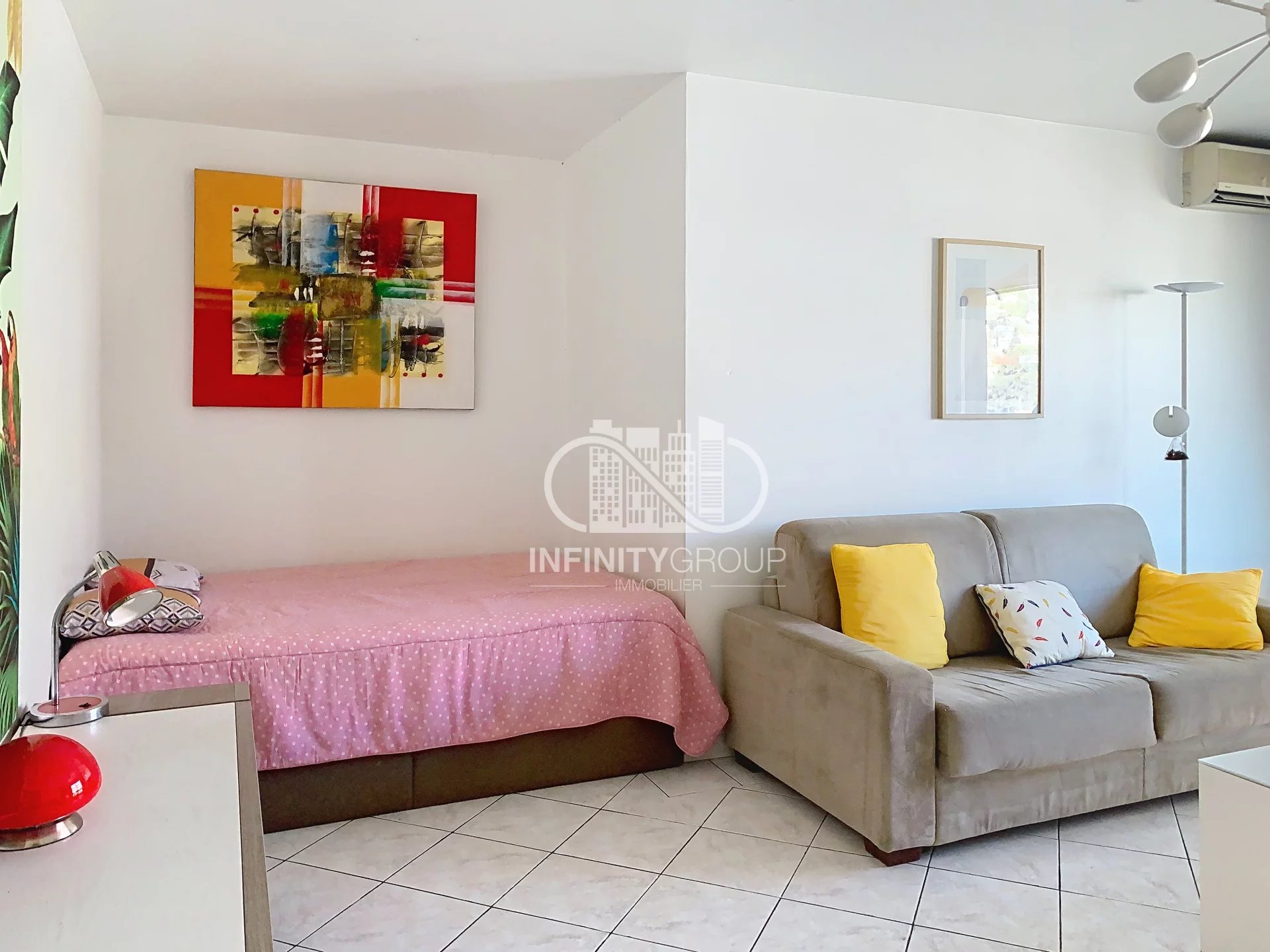 CANNES CARNOT - Au calme dans une résidence sécurisée avec gardien et ascenseur. Au 5ème étage avec vue sur les collines, très beau et vaste studio comprenant une entrée avec placard, un séjour très lumineux et climatisé avec coin nuit, une cuisine indépendante aménagée et équipée donnant sur une agréable terrasse, une salle d'eau avec wc. Une cave. Eau chaude et chauffage compris dans les charges. Une place de stationnement privative est disponible en sus pour 50€/mois. A visiter sans plus tarder !