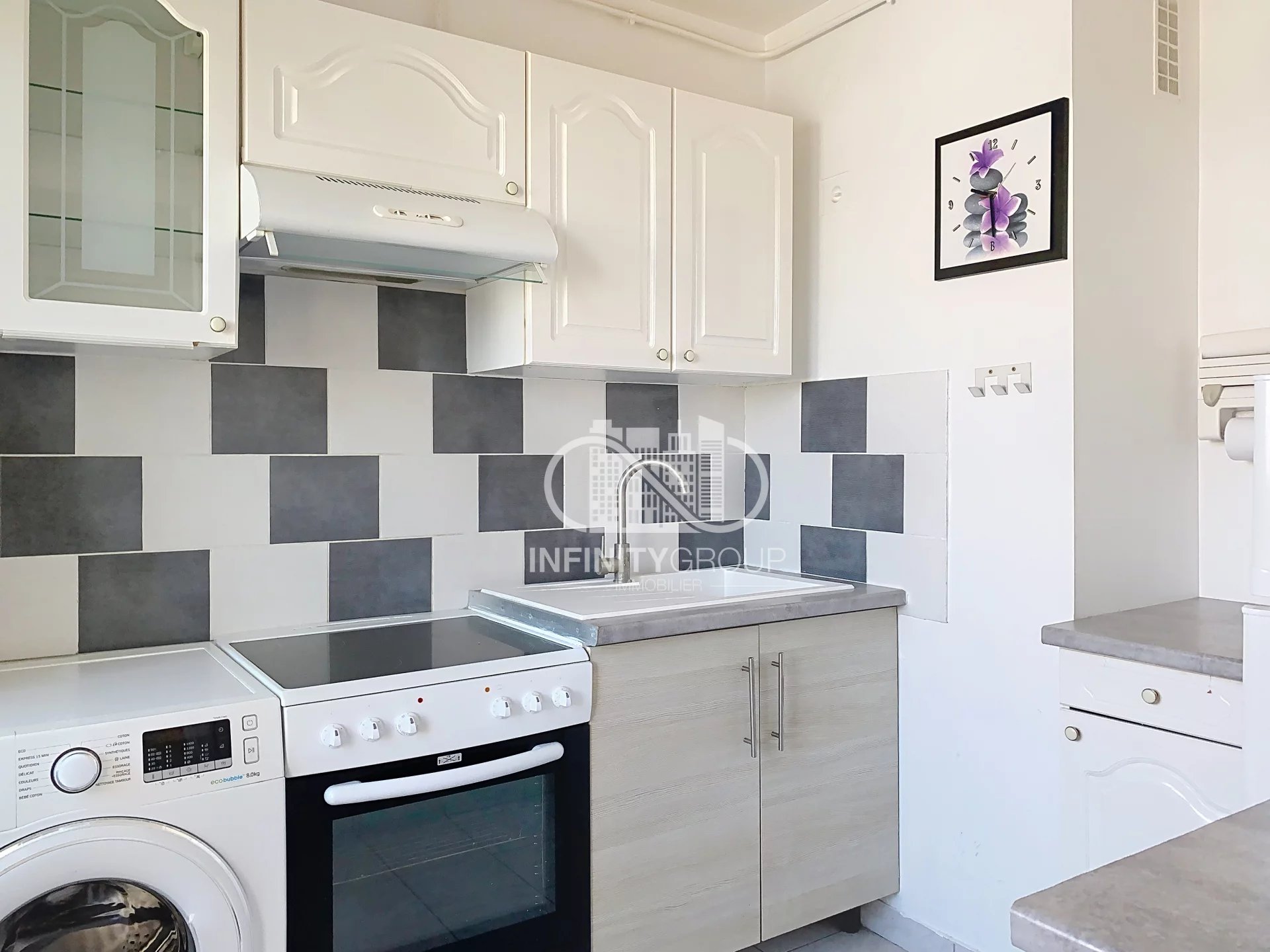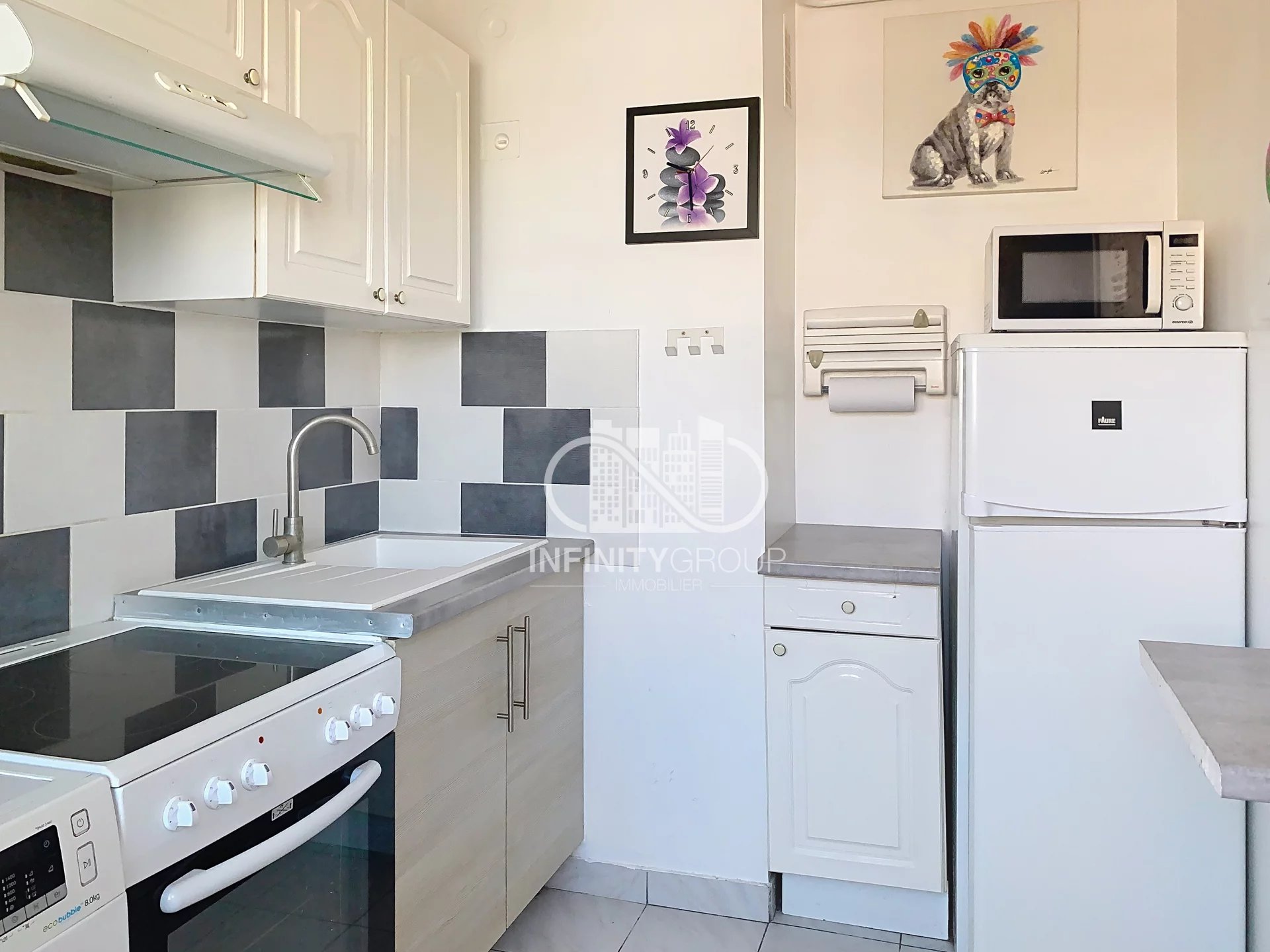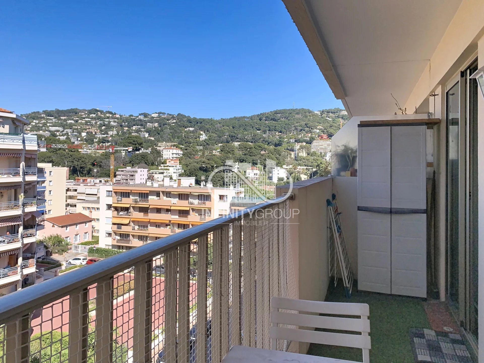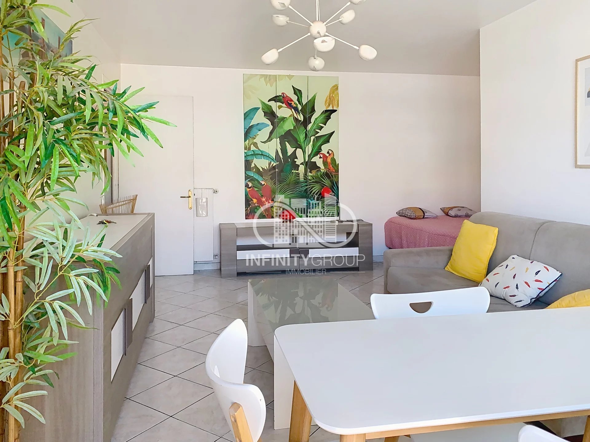 CANNES CARNOT - Au calme dans une résidence sécurisée avec gardien et ascenseur. Au 5ème étage avec vue sur les collines, très beau et vaste studio comprenant une entrée avec placard, un séjour très lumineux et climatisé avec coin nuit, une cuisine indépendante aménagée et équipée donnant sur une agréable terrasse, une salle d'eau avec wc. Une cave. Eau chaude et chauffage compris dans les charges. Une place de stationnement privative est disponible en sus pour 50€/mois. A visiter sans plus tarder !