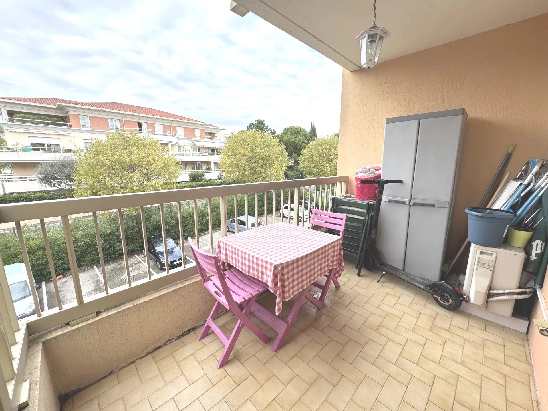 Climatisation, cuisine équipée, balcon, ascenseur , très proche commerces , gare , bus, piscine dans la copropriété.
