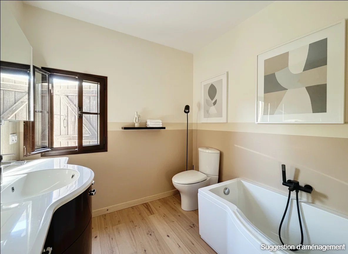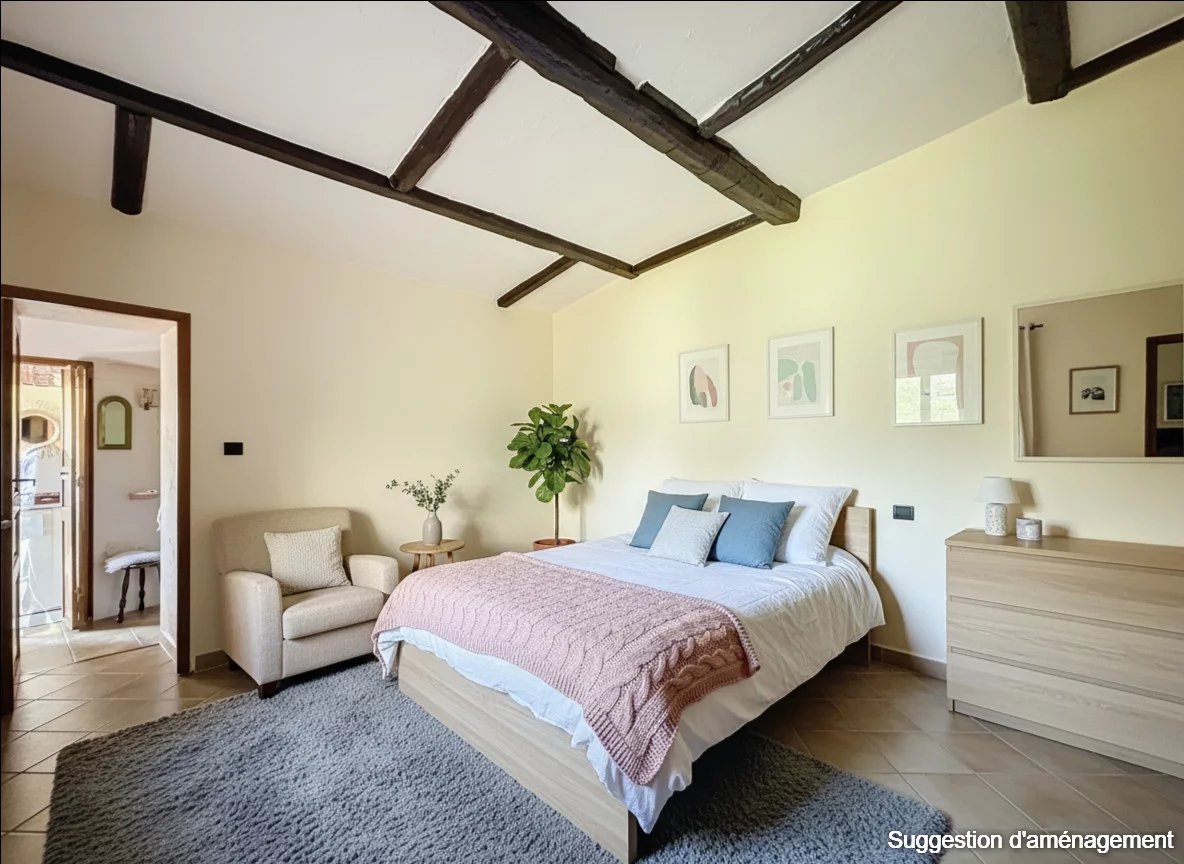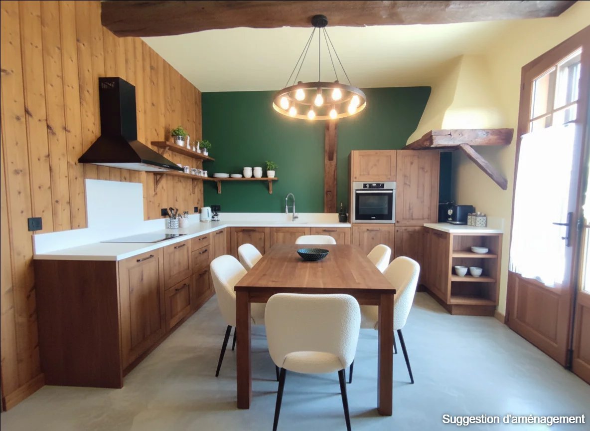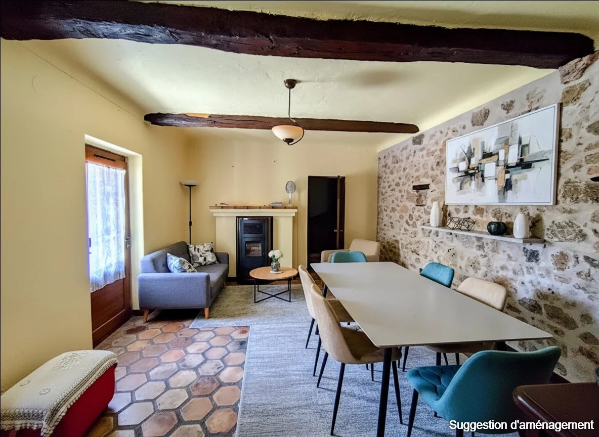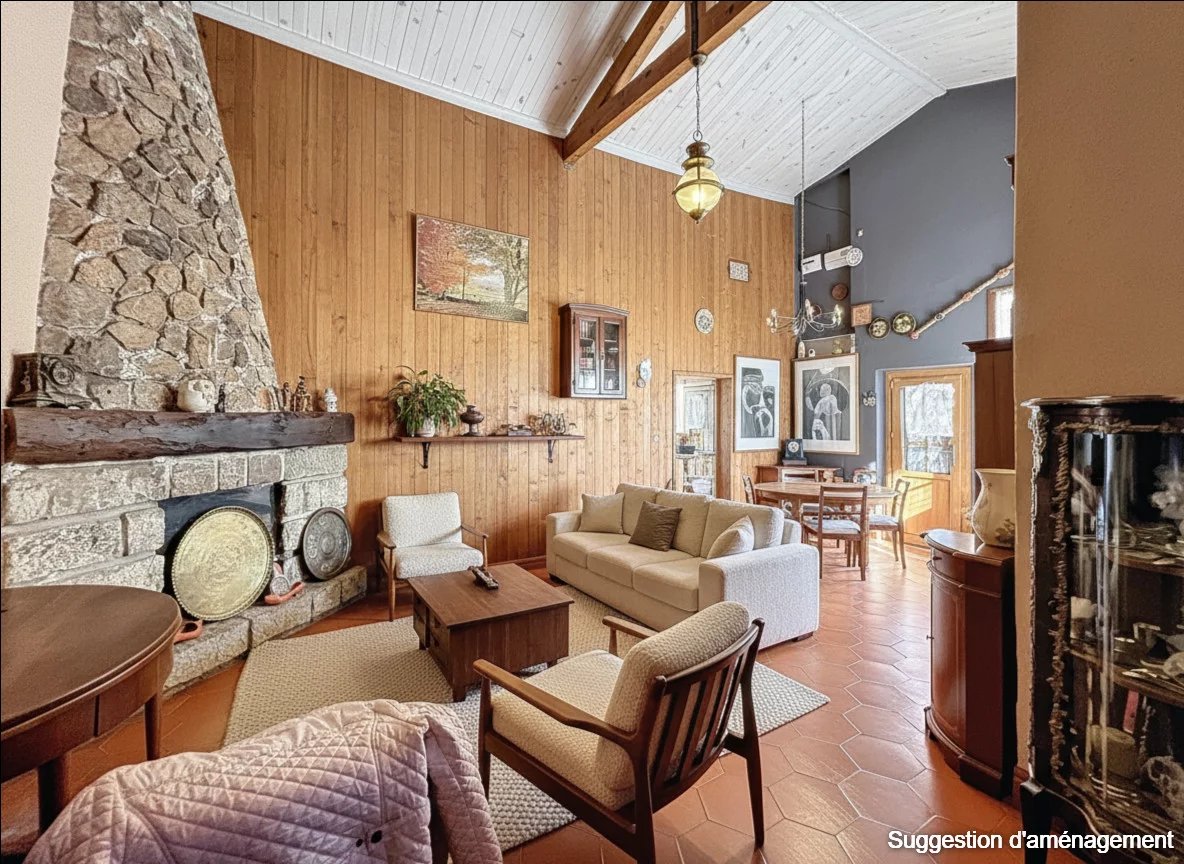 Pièce de vie spacieuse avec poutres apparentes et cheminée, cuisine indépendante, 3 chambres, salle de bain, une salle d'eau et 2 WC.